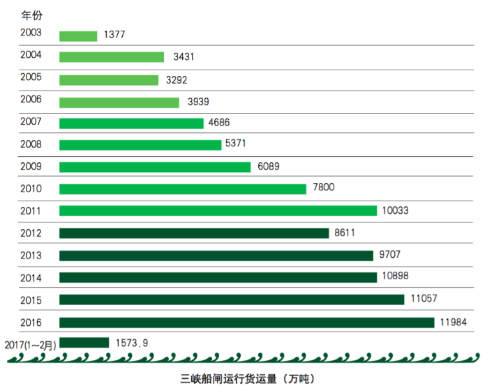 投入運行以來,三峽船閘過閘貨運量逐年遞增,2011年首次突破億噸,提前19年達(dá)到設(shè)計能力。2014年至2016年連續(xù)3年貨運量突破億噸。截至2017年3月7日,三峽船閘累計運行12.87萬閘次,過船73.1萬艘次,通過旅客1181.5萬人次,貨運量10.01億噸。